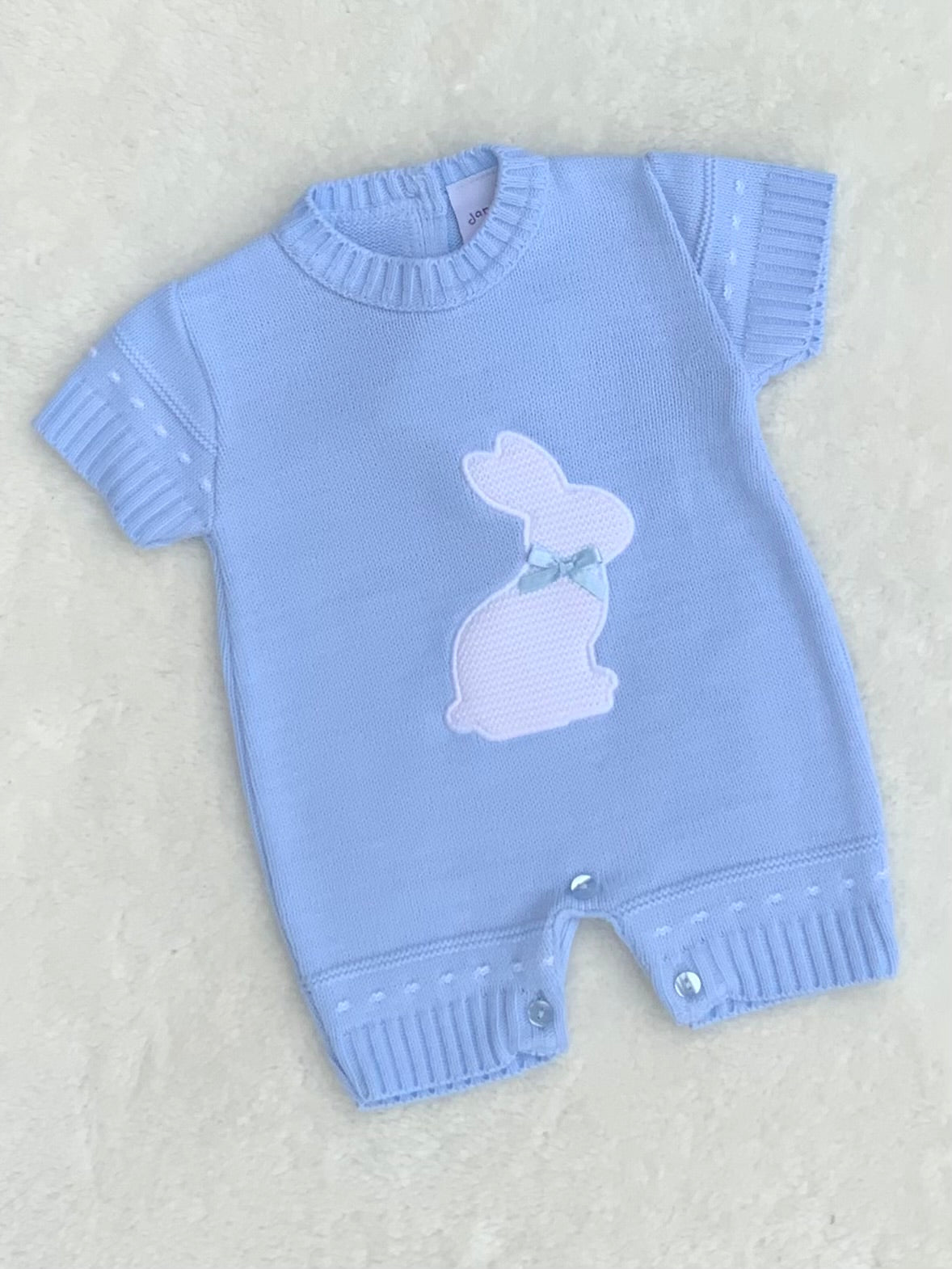 DANDY baby boys blue knitted all one shorts romper bunny motif