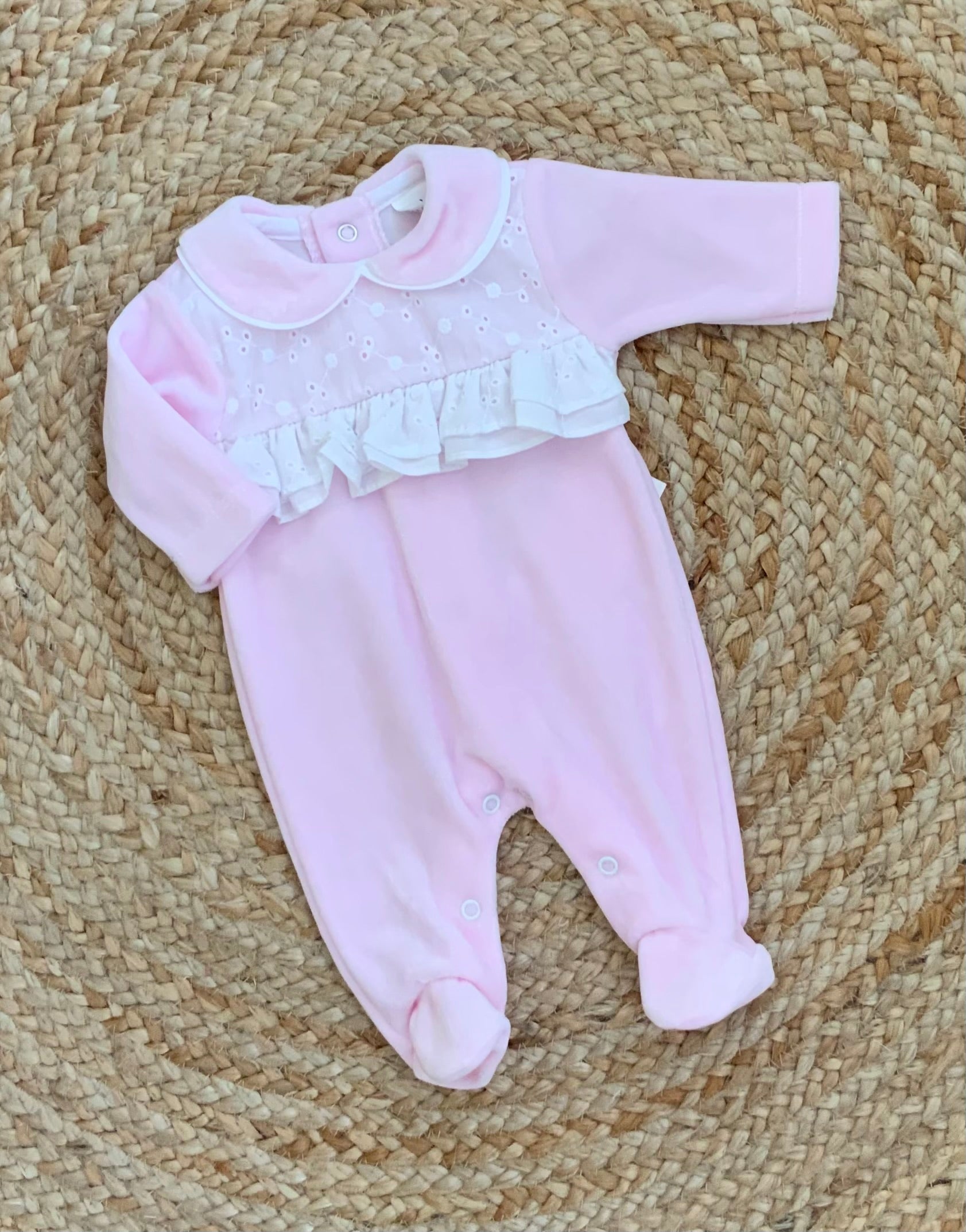 Velour all in one romper finished with broderie anglais detailing to chest,Prestud fastening down back and into legs ,