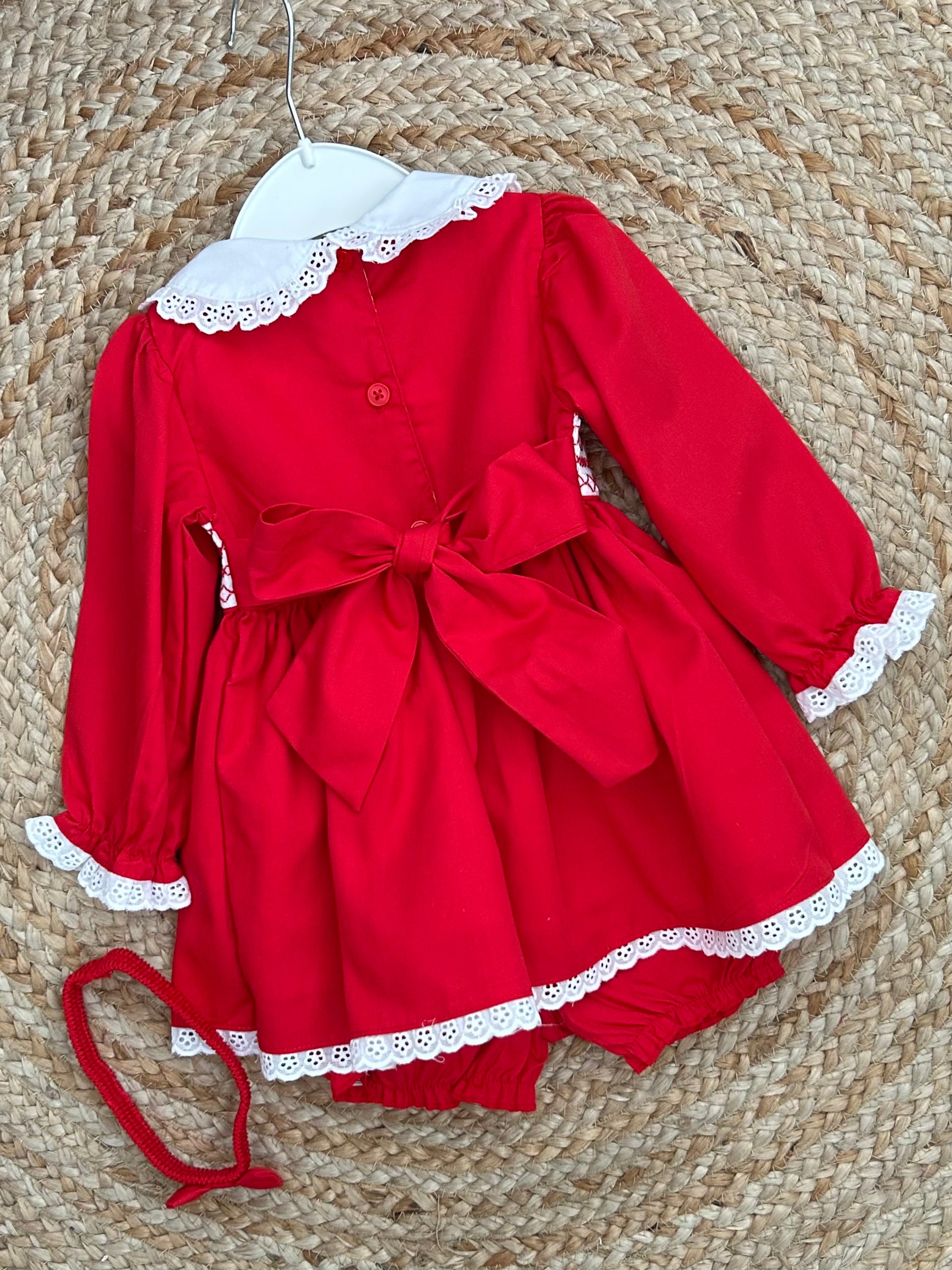 Dress has panel of smocking to front finished with trim to collar cuffs and bottom